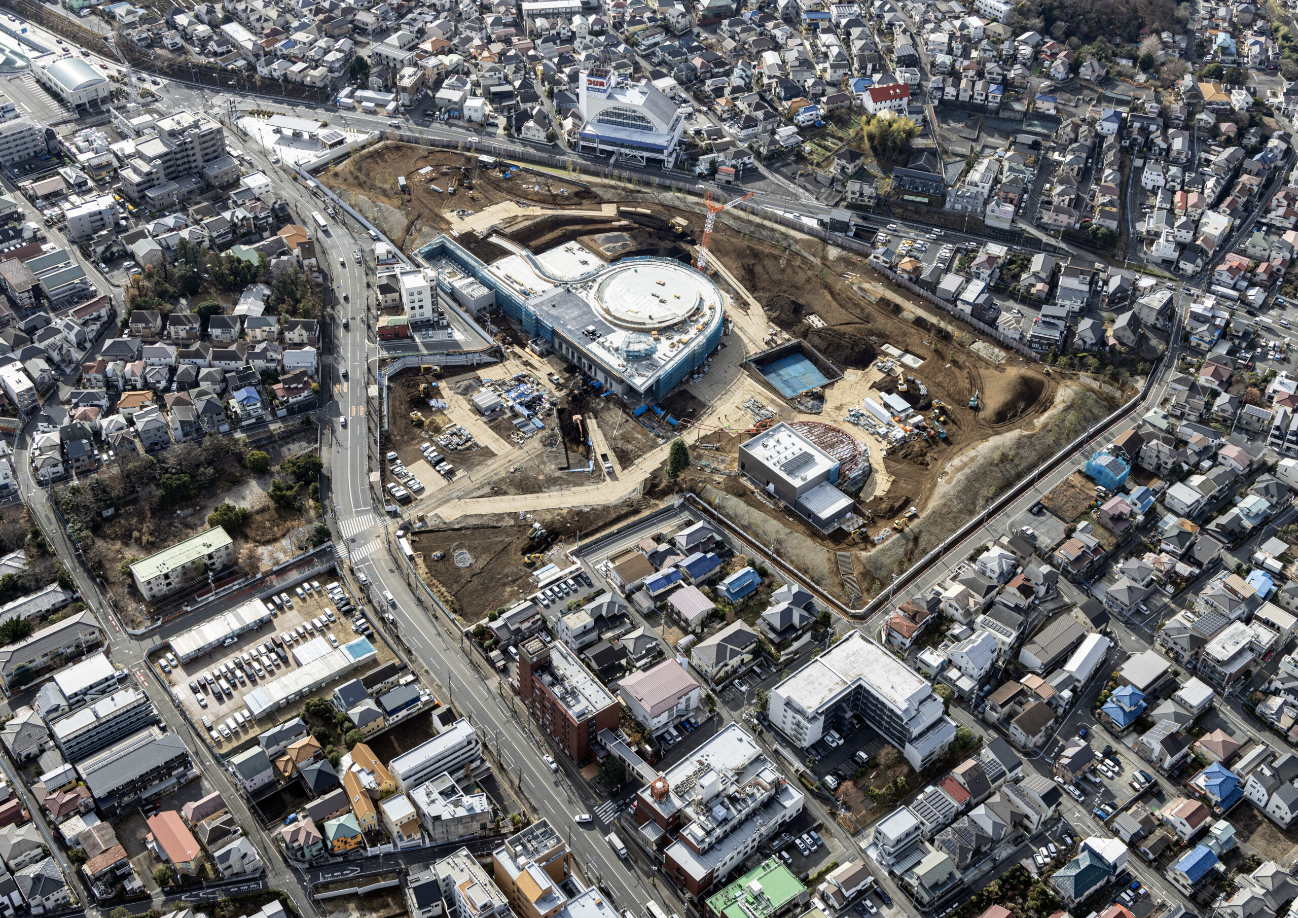 現在、メイン棟の屋上階の躯体工事や屋外設備の基礎コンクリート打設、大屋根の基礎配管埋設、外構では植栽や散水が行われています。