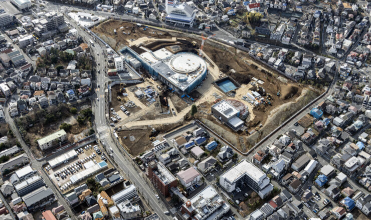現在、メイン棟の屋上階の躯体工事や屋外設備の基礎コンクリート打設、大屋根の基礎配管埋設、外構では植栽や散水が行われています。