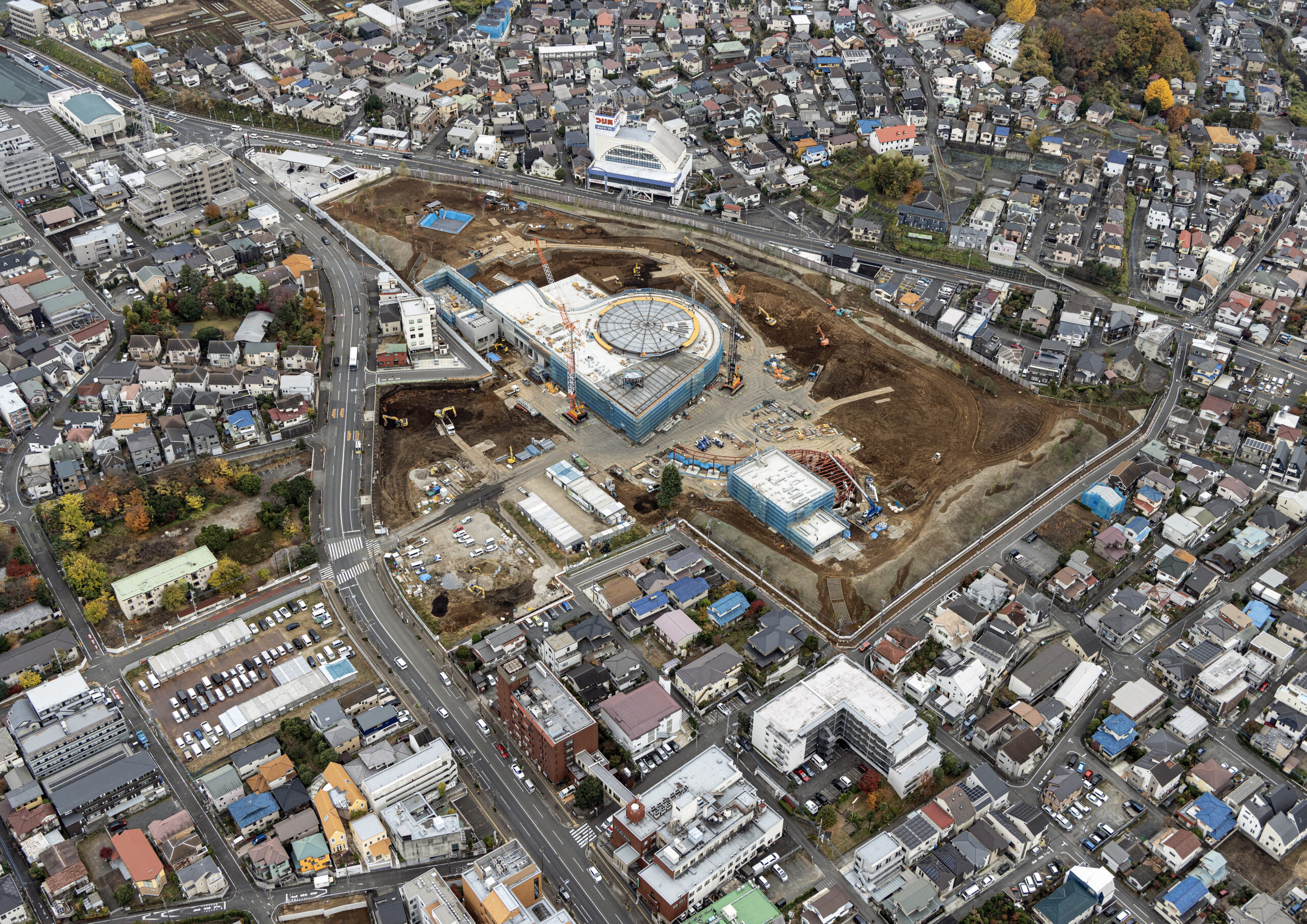 現在、メイン棟内部の内部の足場組み立てや、メイン棟屋上の躯体工事、植栽工事などが行われています。